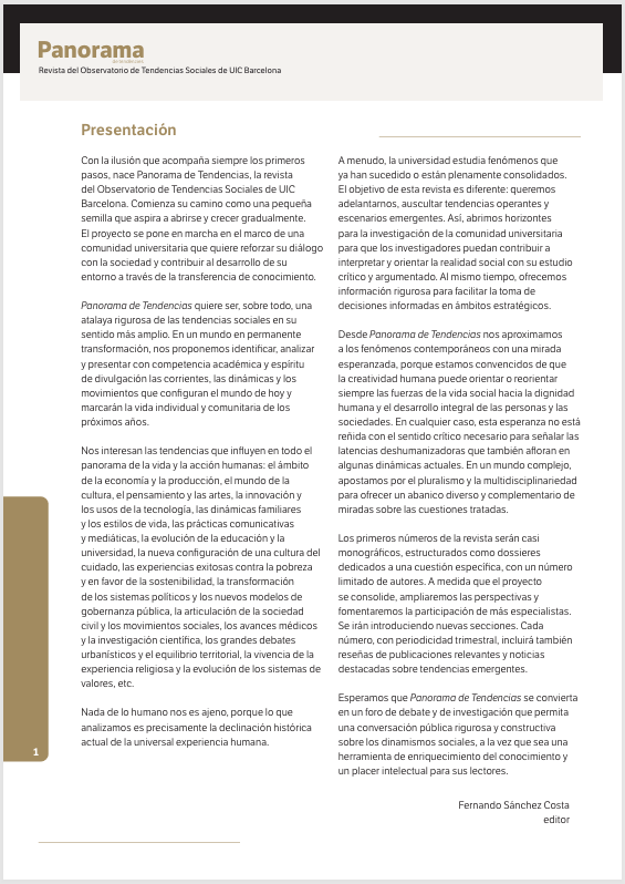 Con la ilusión que acompaña siempre los primeros pasos, nace Panorama de Tendencias, la revista del Observatorio de Tendencias Sociales de UIC Barcelona. Comienza su camino como una pequeña semilla que aspira a abrirse y crecer gradualmente. El proyecto se pone en marcha en el marco de una comunidad universitaria que quiere reforzar su diálogo con la sociedad y contribuir al desarrollo de su entorno a través de la transferencia de conocimiento.